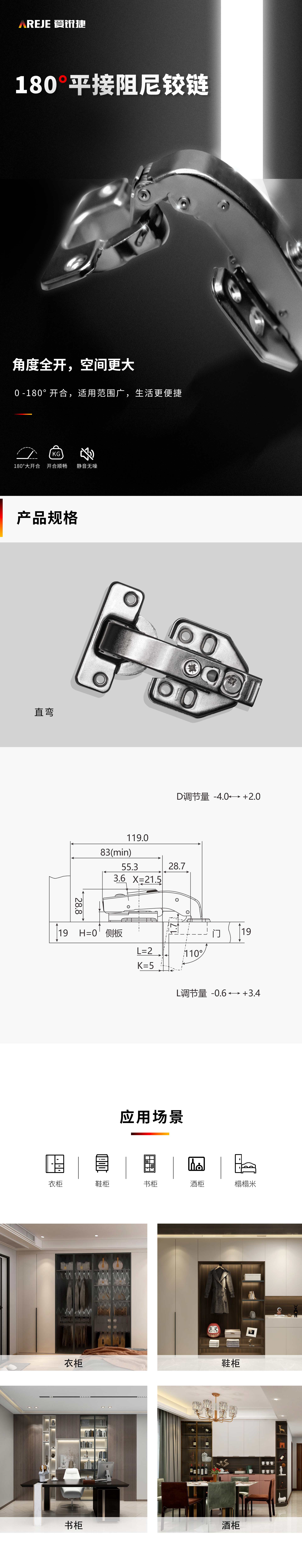 【180度平接阻尼铰链】-开启角度:180°-铰杯厚度:11.5mm-铰杯直径:35mm-面板(K)尺寸:3-10mm-门可选用厚板:14-26mm-角度全开,空间更大,生活更便捷-阻尼缓冲,静音舒适-轻松脱卸底座,安装、拆卸方便